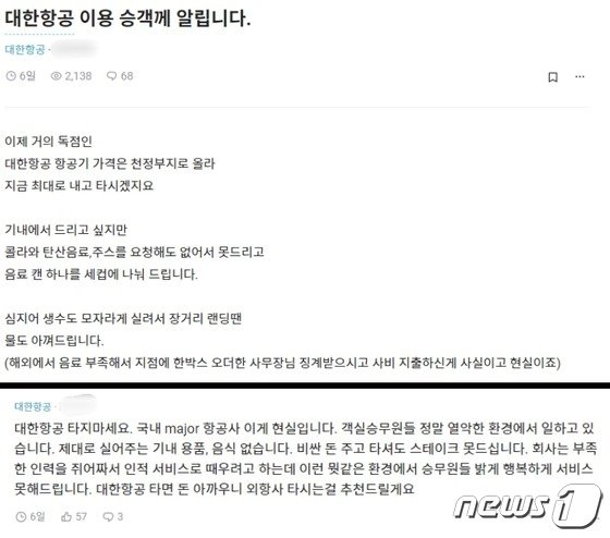 이외에도 “대한항공 타지 마라. 객실 승무원들 열악한 환경에서 일하고 있다”며 “회사는 부족한 인력 쥐어짜서 인적 서비스로 때우려고 하는데, 이런 환경에서 승무원들 역시 밝고 행복하게 서비스 못 해 드린다. 대한항공 타면 돈 아까우니 외항사 타는 걸 추천한다”는 댓글도 많은 추천을 받았다.