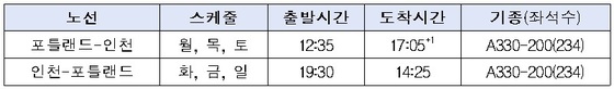 인천-포틀랜드 노선은 인천공항에 처음 개설되는 신규 노선으로, 주3회 운항한다.