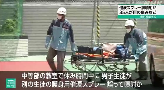 니혼테레비뉴스는 11일 오전 10시쯤, 신주쿠구 와카마쓰정(町)에 위치한 도쿄한국학교의 한 교실에서 한 학생이 호신용 최루 스프레이를 잘못 분사하는 사고가 발생했다고 보도했다.