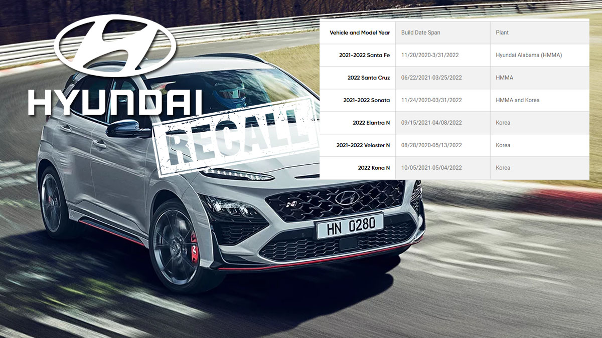 이 문제가 발생하는 차량은 △2020년 11월20일~2022년 3월31일 현대차 앨라배마 공장(HMMA)에서 제조된 2021~2022년형 산타페 △2021년 6월22일~2022년 3월25일 HMMA에서 제작된 2022년형 산타크루즈 △2020년 11월24일~2022년 3월31일 HMMA와 한국에서 제조된 2021~2022년형 소나타 △2021년 9월15일~2022년 4월8일 한국서 제조된 2022년형 엘란트라 N △2020년 8월28일~2022년 5월13일 한국서 제조된 2021~2022년형 벨로스타 N △2021년 10월5일~2022년 5월4일 한국서 제조된 코나 N 등이다.