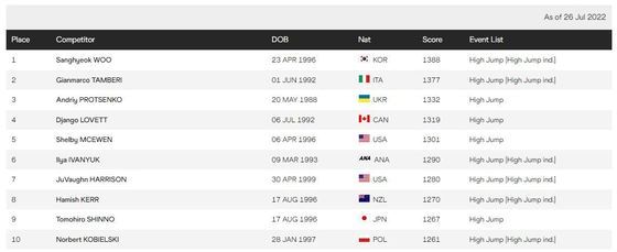 지난 7월26일 경기를 기준으로 업데이트한 남자 높이뛰기 순위에서 우상혁은 그 동안 1위를 지키전 장마르코 탬베리(이탈리아)를 2위(1377점)로 밀어내고 가장 맨 위 자리(1388점)에 이름을 올렸다.