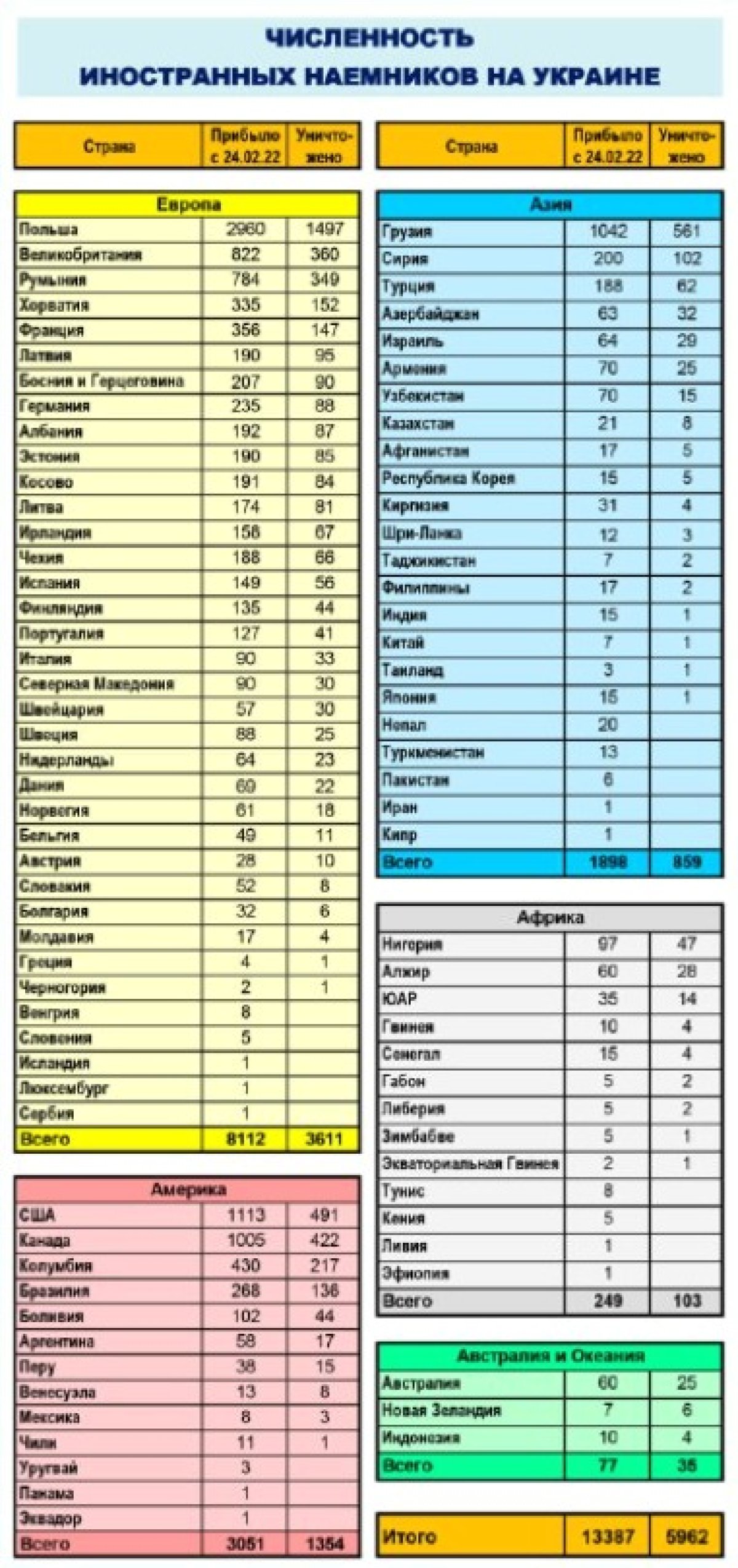 이 통계에 따르면 우크라이나의 외국인 용병 중에는 폴란드인이 가장 많은 것으로 집계됐다. 2690명의 폴란드인 용병이 참전했으며 이 중 1497명이 전사한 것으로 알려졌다.