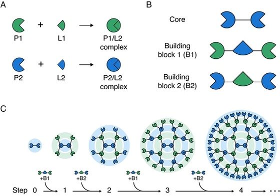 즉, 서로 특이적으로 반응하는 두 쌍의 단백질과 리건드(P1/L1 과 P2/L2)를 이용해 코어 단백질에 두 종류의 빌딩 블록을 순차적·반복적으로 결합했다.