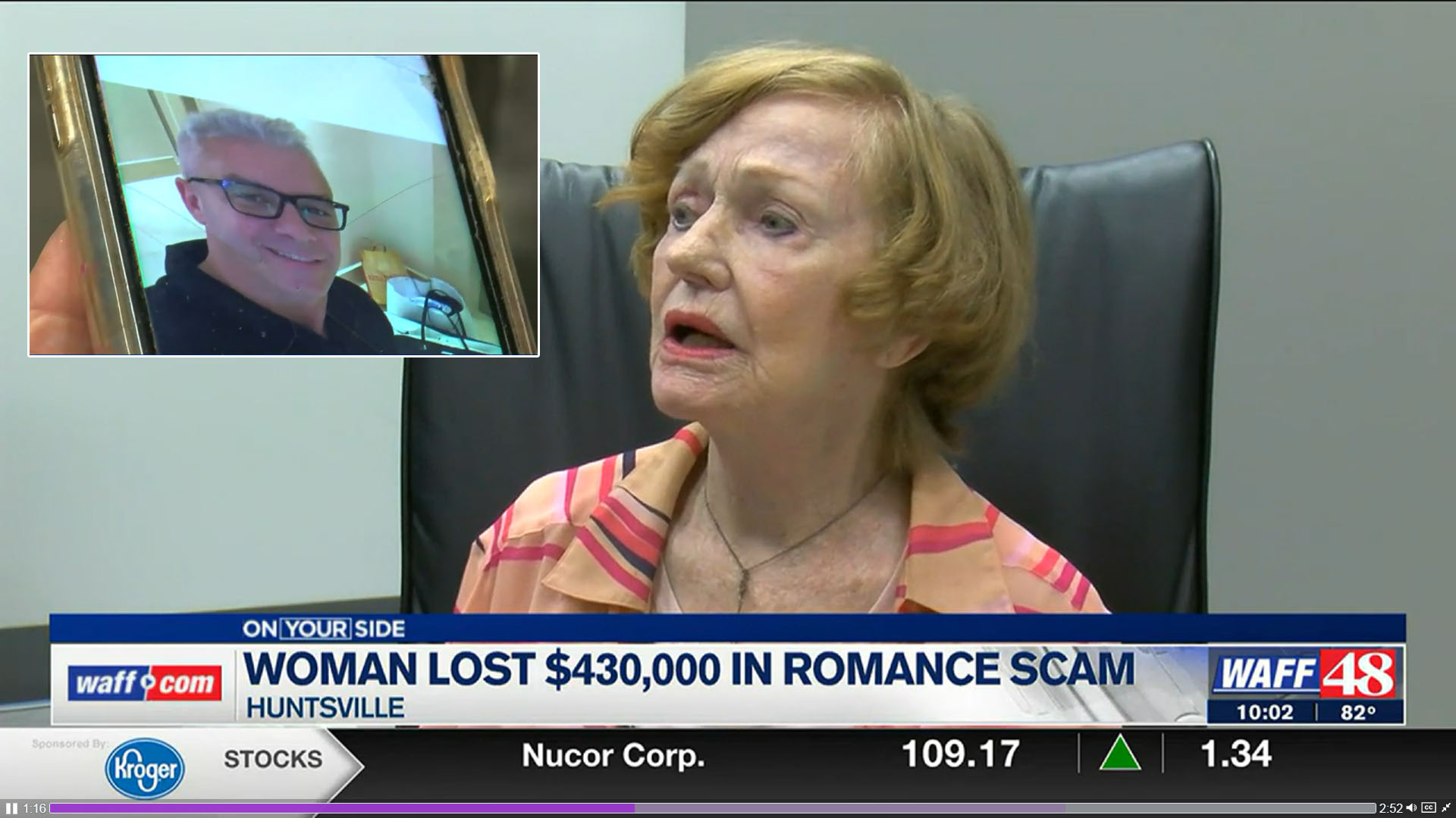 앨라배마의 한 여성이 무려 8년간(!) 3명의 남성에게 로맨스 사기를 당해 43만 달러를 빼았겼다고 헌츠빌 지역방송 WAFF가 보도했다. WSFA12 뉴스는 “이러한 사기가 증가하고 있으며, 외로운 과부들을 잡아먹고 있다”고 보도했다.