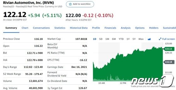이날 리비안의 주가는 뉴욕증시에서 전거래일보다 5.11% 상승한 122.12 달러를 기록했다.