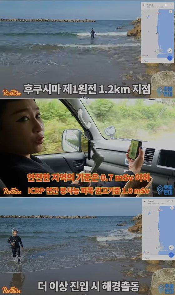 영상에는 자막을 통해 ICRP(국제방사선방호위원회)연간 방사능 피폭 권고기준 1.0mSv이라는 내용과 함께 당일 측정한 원전 근처 방사선량이 2.71mSv 수준이라고 공개했다.