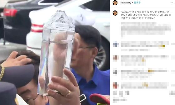 “마실 수 있다면서요?”…후쿠시마 바닷물 담아 日대사관 가져간 리아
