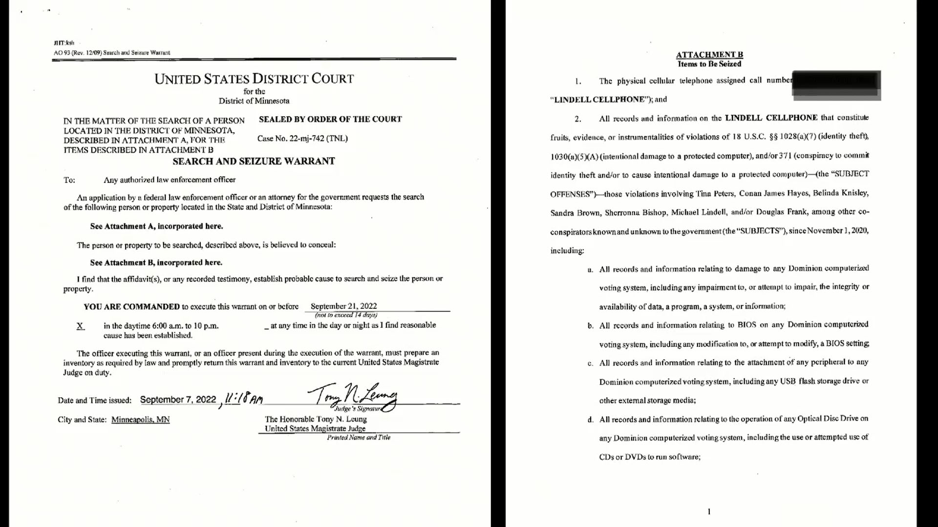 린델에 따르면, FBI 요원들은 덴버 소재 도미니언 보팅 시스템 자료와 관련된 연방 영장을 가지고 그의 전화기를 가져갔다. 도미니언은 린델을 명예훼손으로 고소하고 있는데, 2020년 선거를 트럼프로부터 도둑질했다는 부정선거 주장과 관련된 것이다.