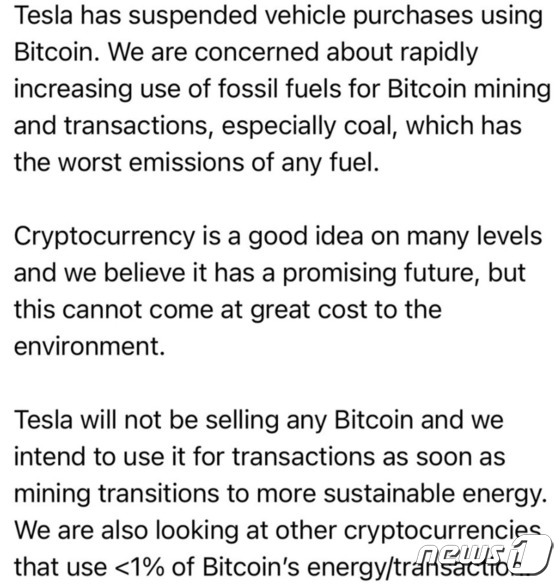 머스크는 지난 13일 돌연 비트코인 결제를 취소한다고 밝혔다. 그는 자신의 트위터를 통해 발표한 온라인 성명에서 비트코인이 전기를 너무 많이 먹어 지구환경에 악영향을 미친다며 결제를 취소한다고 밝혔다.