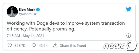 일론 머스크 테슬라 최고경영자(CEO)가 돌연 비트코인 결제를 취소한 직후 도지코인 개발팀과 공동으로 거래 효율성을 높이는 작업을 하고 있다고 밝혔다.