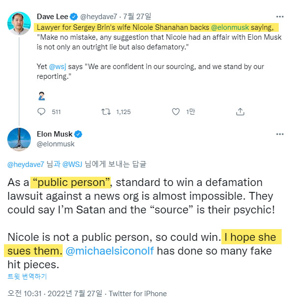 일론 머스크(Elon Musk)는 구글 공동창업자 세르게이 브린(Sergey Brin)의 별거 중인 아내와 바람을 피웠다고 보도한 월스트릿저널(WSJ)을 그녀가 고소해야 하며, 그가 이번 주에 브린과 막 이야기를 나눴다고 말했다고 비즈니스 인사이더가 보도했다.