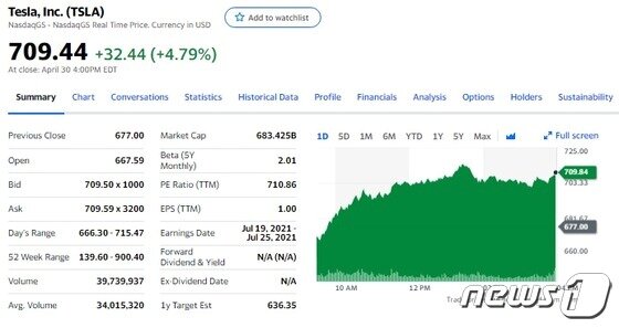 | 테슬라 주가 현황 – 야후 파이낸스 갈무리 |