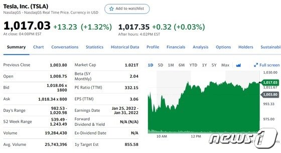 테슬라의 주가는 머스크가 주식을 추가 매도했다는 소식으로 장 초반 984 달러까지 하락했으나 오후 들어 상승 반전에 성공, 결국 1.32% 상승 마감했다.