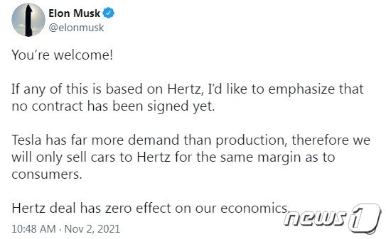 머스크는 트위터에서 “허츠와의 계약이 아직 체결되지 않았다는 점을 강조하고 싶다. 테슬라는 생산보다 수요가 훨씬 많으므로 허츠에 소비자와 같은 가격으로 전기차를 판매할 것이다. 허츠와의 거래가 테슬라의 매출에 전혀 영향을 주지 않을 것”이라고 밝혔다.
