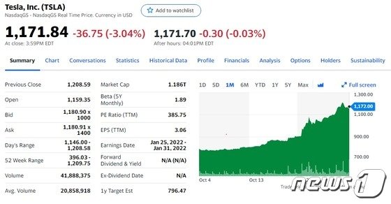 이날 허슬라의 주가는 정규장에서 3.04% 급락한 1171.84달러를 기록했다. 시간외거래에서도 0.03% 추가 하락하고 있다.