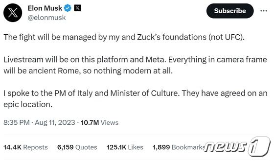 앞서 머스크는 지난 6월 저커버그에게 케이지 결투를 제안했고, 저커버그가 이에 응함에 따라 세기의 대결이 성사됐다.