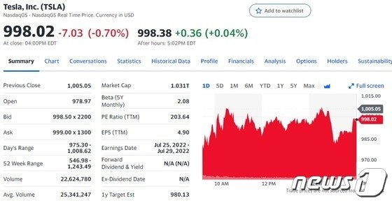 25일(현지시간) 뉴욕증시에서 테슬라의 주가는 전거래일보다 0.70% 하락한 998.02 달러를 기록했다.