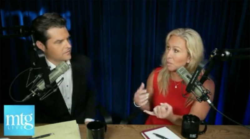 마조리 테일러 그린 하원의원(오른쪽)이 맷 게츠 의원과 함께 한 팟캐스트 방송에서 조지아 공화당원들이 올 선거에서 에이브럼스가 주지사에 당선되면 조지아를 떠날 것이라고 말했다고 전했다.