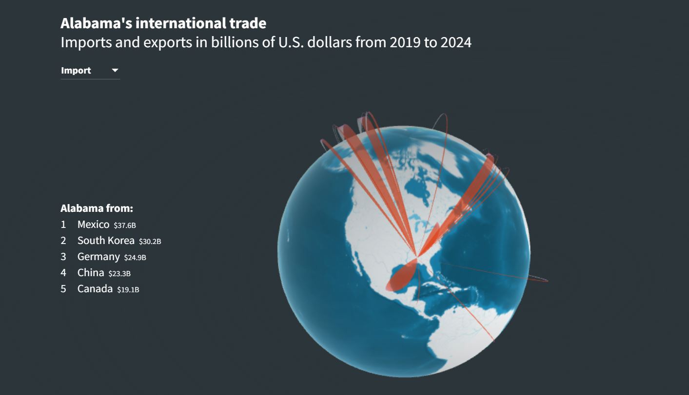 멕시코는 2024년 앨라배마에서 석유가 풍부한 쿠웨이트를 제치고 가장 큰 원유 공급국이었다. 하지만 어쩌면 더 중요한 것은 멕시코 상품에 대한 관세가 앨라배마의 크고 성장하는 자동차 제조 산업에 미칠 영향일 수도 있다는 관측이다. 앨라배마는 매년 배선, 시트, 스티어링 휠 등 자동차 제조에 사용되는 수십억 달러 상당의 특정 부품을 멕시코에서 수입하고 있는 형편이다.