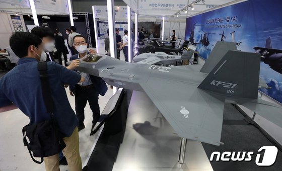 지난달 31일 서울 강남구 양재동 at센터에서 열린 제6회 국방과학기술 대제전에서 관람객들이 한국항공우주산업(KAI)에 전시된 KF21 전투기의 모형을 둘러보고 있다. /뉴스1 © News1 김진환 기자