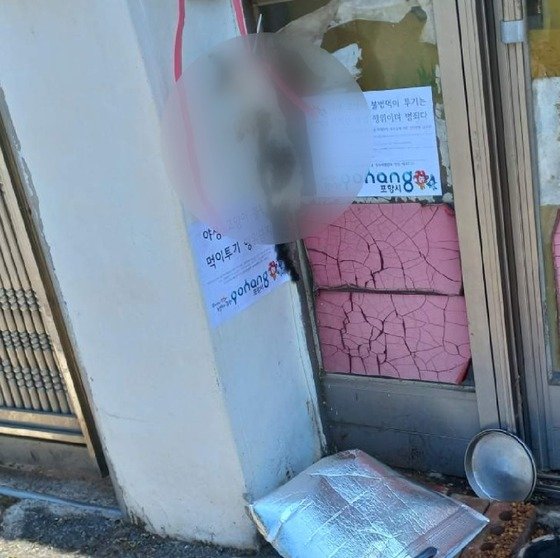당시 현장에는 포항시 안내문을 사칭한 ‘먹이 금지’ 경고문이 붙어 있었다. 사체 아래에는 밥그릇과 사료들이 내동댕이쳐져 있었다.