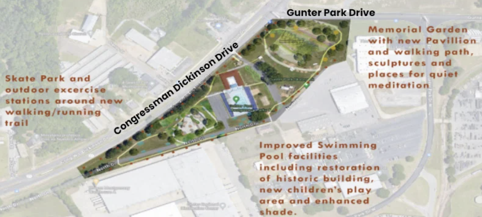 몽고메리시 군(軍)·재향군인위원회는 이번 공원을 몽고메리 순환도로 안쪽, 2390 Congressman Dickinson Drive에 건립할 계획이라고 밝혔다. 해당 부지는 현재 건터(Gunter) 수영장과 건터 파크 스케이트파크 인근이며, 전체 면적은 약 14.4에이커에 달한다.
