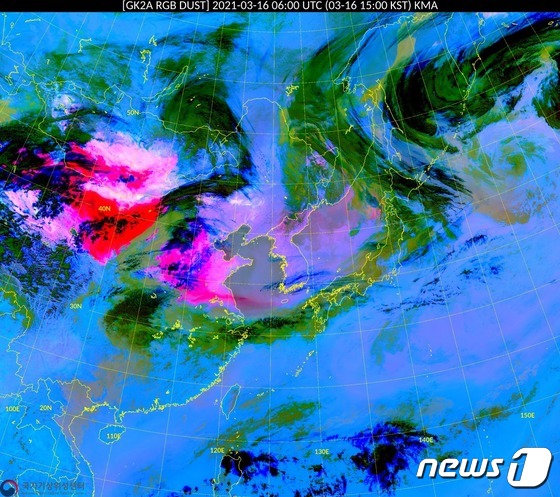 | 16일 새벽 6시 에 촬영된 천리안2A 위성 사진. 16일 중국 북동부에서 발원한 황사가 한반도로 유입되는 모습. © 뉴스1 |