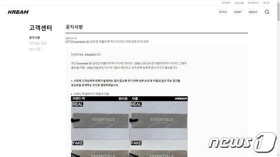 앞서 크림은 공지사항을 통해 미국 럭셔리 브랜드 ‘피어 오브 갓 에센셜’ 브랜드 상품의 정품·가품 판단 기준 사진이 포함된 공지글을 게재했다.
