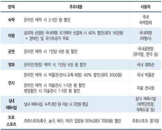 숙박은 온라인 예약 시 7만 원 이하의 경우 2만 원, 7만 원 초과의 경우 3만원을 할인한다.여행 분야에서는 접수·공모를 통해 선정된 국내 여행상품에 대해 조기 예약 및 선결제 시 상품가의 40%를 할인한다.