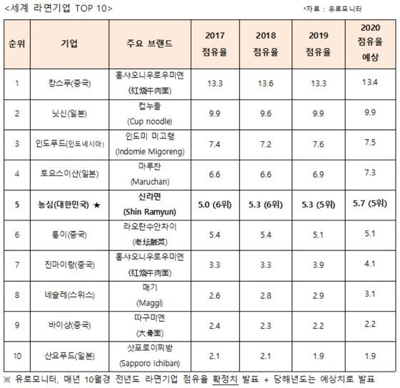 2019-2020 세계 라면기업 순위(농심 제공)© 뉴스1 |