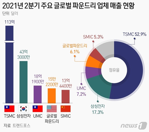 현재 글로벌 반도체 시장에서 삼성전자는 치열한 경쟁을 하고 있다. 시장조사업체 트렌드포스에 따르면 올해 2분기 전세계 파운드리 시장에서 삼성전자의 점유율은 17.3%(2위)로, 1위인 대만의 TSMC(52.9%)에 크게 뒤졌다. 추격에만 집중해도 힘든데, 올해 초 파운드리 시장 재진출을 선언한 인텔까지 가세하면서 앞뒤로 강적에 놓였다.