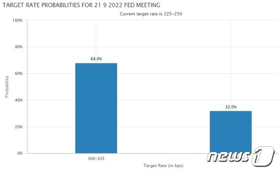CPI 발표 직후 시카고상품거래소(CME)에서 거래되는 연방기금금리(미국의 기준금리) 선물은 연준이 9월 FOMC에서 1%포인트의 금리인상을 할 확률을 32%로 반영하고 있다. 0.75%포인트의 금리인상 확률은 68%다.