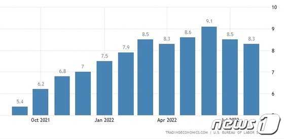 미국의 월간 CPI는 지난 6월 9.1%로 1981년 11월 이후 최대 상승률을 기록한 이래, 7월 8.5%로 상승폭이 약간 둔화했지만 이달에는 미미한 감소세에 그친 것이다.