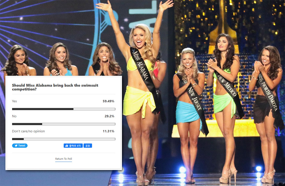 미스 앨라배마 대회에서 수영복 심사가 사라진 것은 지난 2019년의 일이다. 최근 AL닷컴은 수영복 심사를 다시 부활시켜야한다고 생각하느냐는 온라인 설문조사를 실시해 눈길을 끌고 있다.