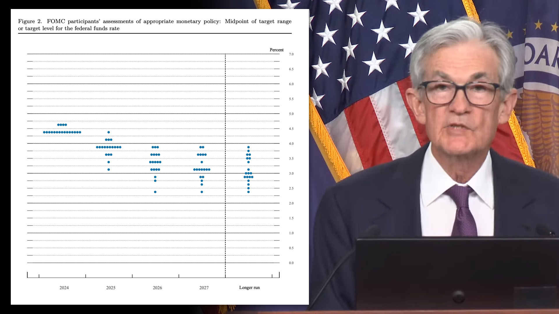 인플레이션(핵심 개인소비지출 기준) 전망은 3개월 전에 비해 상향 조정됐는데 올해 2.6%에서 2.8%, 내년 2.2%에서 2.5%로 높아졌다. 성장률은 올해 2.5%, 2025년 2.1%로 전망됐는데, 이는 모두 9월 예상치의 2 %보다 상향됐다. 현재 4%인 실업률은 올해 마지막 분기 평균 4.2%, 내년 마지막 분기 4.2%로 예상됐는데 3개월 전 전망치 4.4%보다 낮아졌다.