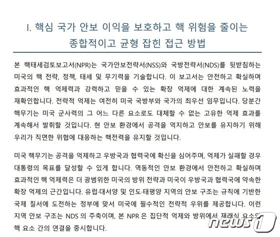 또 “핵 확장 억제는 우방국과 협력국에 자체적으로 핵무기를 획득하지 않고도 전략적 위협에 저항하고 안보를 유지할 수 있다는 자신감을 주는 방식으로 미국의 비확산 목표 성취에 기여한다”는 내용도 담겼다.