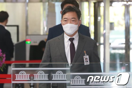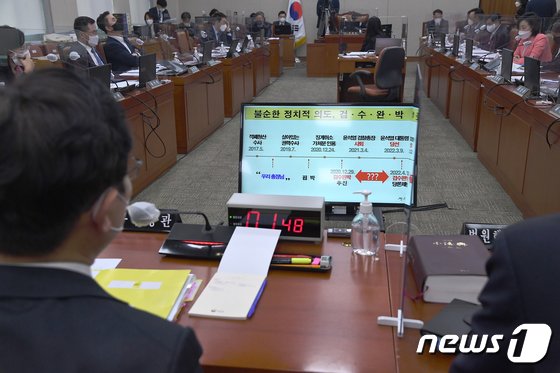 박범계 법무부 장관이 14일 서울 여의도 국회에서 열린 법제사법위원회에서 국민의힘 전주혜 의원이 제기한 ‘검수완박 불순한 정치적 의도’ 질의를 듣고 있다./뉴스1 © News1 이재명 기자