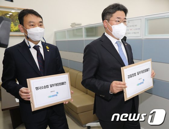 더불어민주당 박찬대, 김용민(왼쪽) 의원이 15일 서울 여의도 국회 의안과에 검찰청법 일부개정법률안과 형사소송법 일부개정법률안을 제출하고 있다./뉴스1 © News1 허경 기자