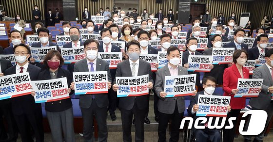15일 오후 국회에서 열린 국민의힘 의원총회에서 권선동 원내대표와 참석자들이 검수완박 절대반대등이 적힌 피켓을 들고 구호를 외치고 있다. (공동취재)/뉴스1 © News1 허경 기자