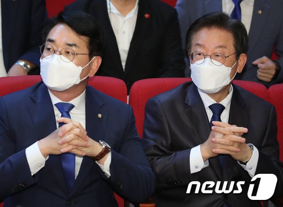 이재명, 박용진 더불어민주당 당대표 후보가 19일 오후 대전 서구문화원에서 열린 더불어민주당 전국자치분권민주지도자회의(KDLC)에 참석해 같은 곳을 응시하고 있다. 2022.8.19/뉴스1 © News1 김기태 기자
