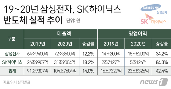 매출액도 삼성전자가 72조8600억원, SK하이닉스 31조9004억원으로 양사 합계는 약 104조7604억원에 이른다. 이는 전년과 비교해 14% 늘어난 수치다.