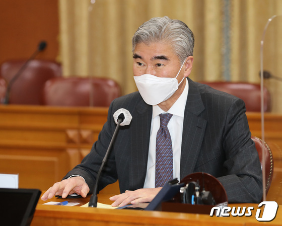 | 성김 미 국무부 동아시아태평양 차관보 대행이 19일 서울 외교부에서 노규덕 외교부 한반도평화교섭본부장과 면담을 하고 있다. 2021.3.19/뉴스1 © News1 |