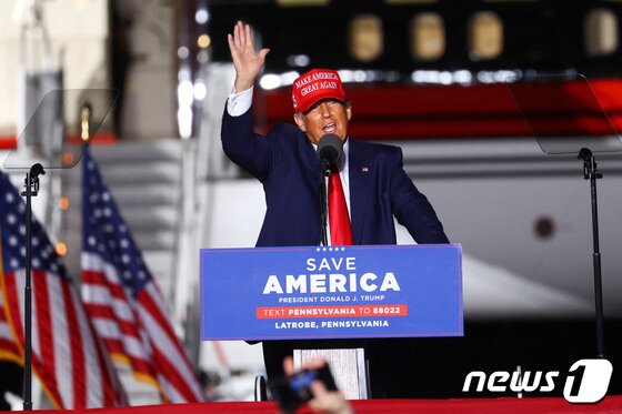 도널드 트럼프 전 미국 대통령(왼쪽)이 5일(현지시간) 펜실베이나 라트로브를 방문해 공화당 메메트 오즈 후보 지지유세를 벌였다. 펜실베이니아는 오는 8일 미국 상원 중간선거에서 최대 격전지 중 하나이다. 트럼프 대통령은 ‘마가'(MAGA·미국을 다시 위대하게)가 적힌 빨간 모자를 쓰고 있다. © 로이터=뉴스1 © News1 최종일 기자