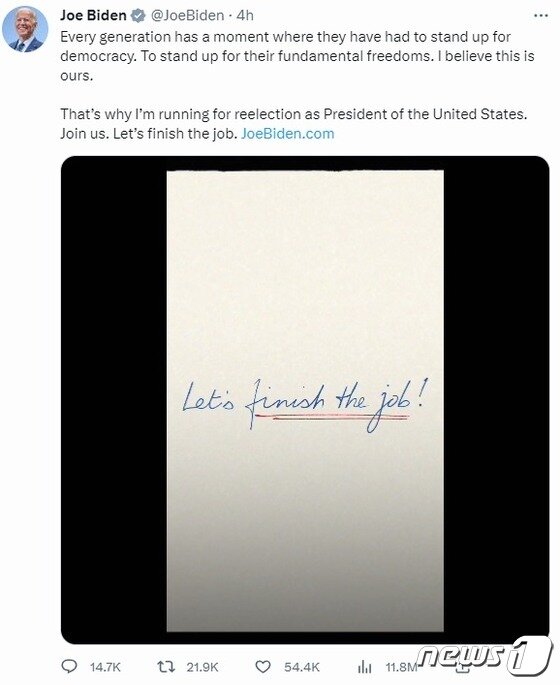 앞서 바이든 대통령은 이날 트위터에 게재한 선거 캠페인 영상에서 재선을 위해 2024년 대선에 출마하겠다고 공식적으로 선언했다. 러닝메이트로는 카멀라 해리스 현 부통령이 다시 나선다.