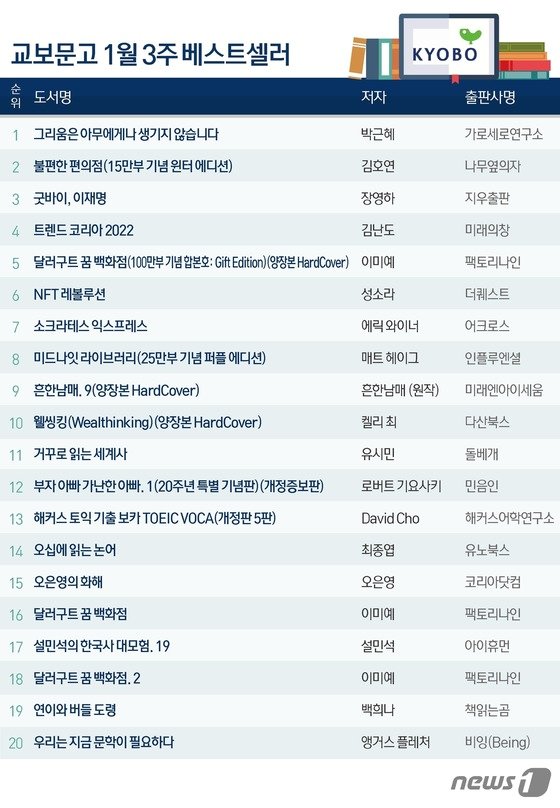 오는 3월 대선을 앞두고 정치인들의 움직임이 서점가에 영향을 주는 가운데, 소설에 대한 관심도 눈에 띈다. ‘불편한 편의점’이 다시 종합 2위에 올랐다. 이어 ‘달러구트 꿈 백화점’, ‘미드나잇 라이브러리’는 직전 주 대비 판매량이 상승하며 인기몰이를 했다.