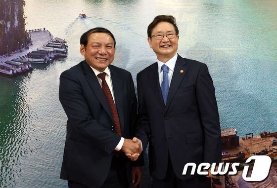 박보균 문화체육관광부 장관이 16일 서울 영등포구 여의도 한강공원 이벤트 광장에서 열리고 있는 문화잇지오 행사(사업명 : 신한류문화다리)에서 응우엔 반 훙(Nguyen Van Hung) 베트남 문체부 장관을 만나 문화, 체육, 관광 분야의 교류협력을 강화하기로 한 뒤 기념촬영을 하고 있다. (문화체육관광부 제공) 2022.10.16 News1