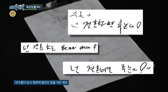 박수홍은 친형의 녹음파일과 메모들도 공개했다. 메모에는 ‘넌 결혼하면 죽는다’ ‘넌 결혼할 팔자가 아니다’라는 글이 담겼다.