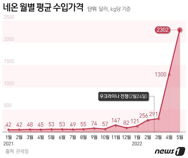 네온 가격은 지난 1월부터 3월까지 kg당 100~200달러대에 머물렀지만 러시아의 우크라이나 침공 영향이 본격화된 4월부터 치솟기 시작해 5월에는 2000달러선을 넘어섰다. 5월 수입가격은 지난해 평균(59달러)과 비교하면 무려 39배나 높다.