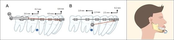 그 결과 하악지 플레이트를 이용한 교정의 치열 후방 이동량이 미니 임플란트보다 두 배가 컸으며, 아랫니가 있는 하악골이 시계방향으로 회전하는 효과를 얻어 턱의 끝 부분이 치료 전보다 뒤로 들어감을 확인했다.