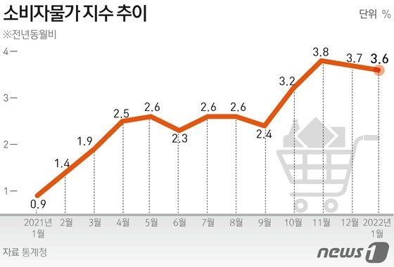 7일 통계청에 따르면 1월 소비자물가지수는 104.69(2020=100)로 지난해 같은 달보다 3.6% 상승했다. 소비자물가 상승률은 지난해 4월부터 6개월 연속 2%대를 보이다가 10월 들어 3%대로 올라섰다.